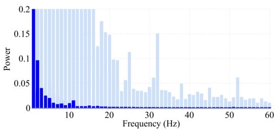 If we assume that the high frequency data recorded by the sensors consists of samples from a real signal f, then if f is band-limited, according to the Nyquist criterion, we can sample the original data at a rate near  ( bandwidth of the signal) and reconstruct f perfectly from the down-sampled data. However, in the real world, most signals are not exactly band-limited, but their power spectrum shows a small magnitude at high frequencies; thus, we can apply a low pass filter to the original signal to make it band-limited. We evaluated the power spectrum of the accelerometer data from each of the 100 walking tests and the 100 balance tests. In Figure 5, we have combined all 100 densities for the walking tests and all 100 densities for the balance tests in the same plot. Figure 5 suggests strong evidence that the  magnitude of the linear acceleration from the walking tests comes from a nearly band-limited signal with band limit  Hz. This observation is in agreement with the findings of  [] about the frequency content of walking data. Therefore, after removing the effect of the gravitational component, all the data coming from the walking tests are preprocessed with a low-pass filter of a cut-off frequency of 15 Hz. Then, from the Nyquist criterion, we can down-sample the signal to a uniform sampling rate of  Hz without risking aliasing.
