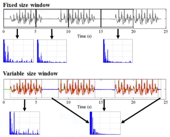 Demonstration of how the traditional feature extraction approach relying on windowing with fixed window size can lead to misleading estimates of any features from the frequency domain. The bottom plot demonstrates how an accelerometer signal is segmented using a switching AR model, and more accurate estimates of frequency domain features can be obtained as a result. We observe this by looking at how the power spectra change.