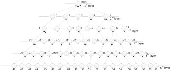 Each node has its fixed level and a relative position, and there is only one default parent node. This tree-shaped wireless network is illustrated in Figure 1. As shown in Figure 1, the network has six layers and 60 nodes. Each node has a default parent node. For example, node is the parent node of node .