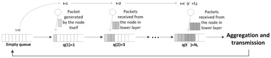 Each node in the data packet generation period receives the data aggregation queues sent by their child nodes, and at most, one data packet is produced by the nodes. Each node in the aggregation and transmission period determines whether to aggregate and transmit. The transmission of the aggregation queue is performed on two adjacent layers. A node that sends the aggregation queue is , and a node which receives the queue is considered to during an aggregation and transmission period. We set a unit time as a cycle . The cycle of all nodes is synchronous. In this system, the nodes in the network are homogenous.