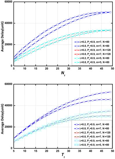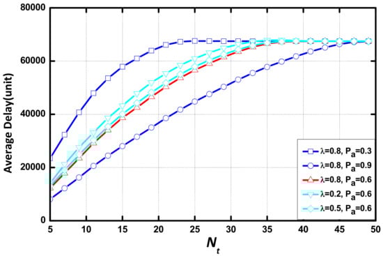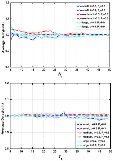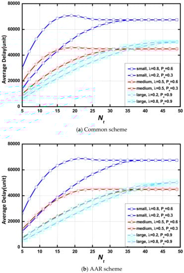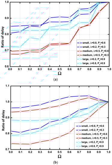 Figure 16c shows that when = 25 and = 25, there was no optimization except for the network whose = 0.8 and = 0.9, as the area where the AAR works is large when the network has a large value of and . Therefore, performance are not affected by the value of except for the network with a large value of and .