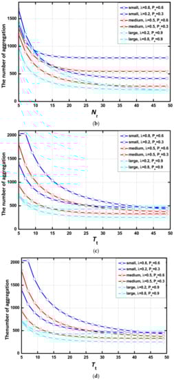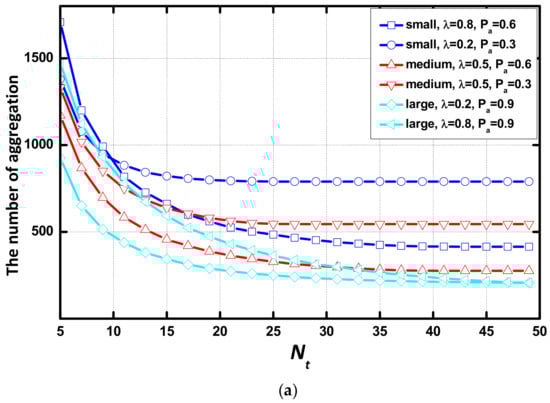 Network lifetime is defined as the death time of the first node in the network [32,35,36]. The main energy consumption of the sensing nodes is while receiving and sending data packets, so reducing the number of aggregations can reduce energy consumption. The optimization performance in terms of lifetime is studied in this sub-section. The expectation of the maximum number of aggregations in the networks that have optimization effect are compared in Table 3. The AAR scheme decreases the maximum number of aggregations in the network, thus postponing the death of the first node in the network. Thus, the lifetime of the network increases. There are optimization effects in different scenarios, and the effect increases with the increase of and .