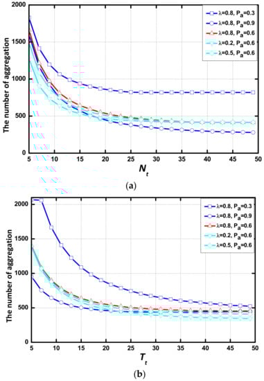 The nodes in the model store the incoming data packets in the aggregation queue. If the number of queued packets is the same as or greater than the predetermined packet aggregation threshold, the queued packets are transmitted as an aggregated packet queue in the aggregation and transmission period (see from Figure 3). The aggregation threshold refers to the maximum number of packets aggregated into a single frame. We denote this predetermined packet aggregation threshold as .