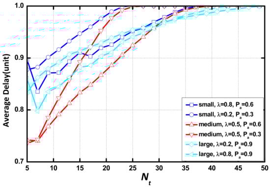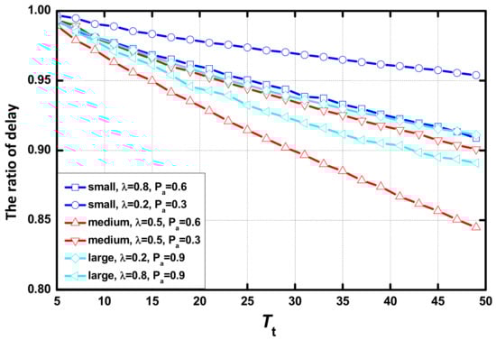 In Figure 16a we find that the optimization performance decreases as the value of increases. The performance disappears when equals 1. When the value of is 15, the optimization effect on the delay also decreases when increases. We notice that there is negative optimization when = 0.3. In the study in Section 5.2, we determine that the large has no constraint on aggregation. is the only parameter that controls the occurrence of aggregation. Therefore, there is no optimization in these environments.