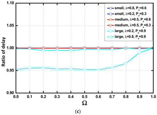 Ratio of delay vs. (a) = 5; (b) = 15; (c) = 25.