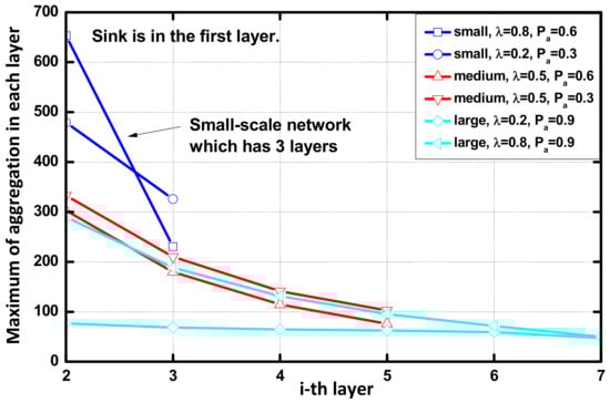 In this subsection, we propose a strategy to adjust the value of and . The expectation of the maximum number of aggregations in each layer of the network using the AAR scheme are calculated. In Figure 17, we see that the number of aggregations decreases with the increase of hops to the sink. Therefore, the nodes far from the sink have remaining energy when the first node dies. In the improved AAR scheme, the nodes far from the sink are set to a smaller value of aggregation timer () and queue length threshold () to reduce delay, so the residual energy can be fully used. The decrease in the number of polymerizations is influenced by .