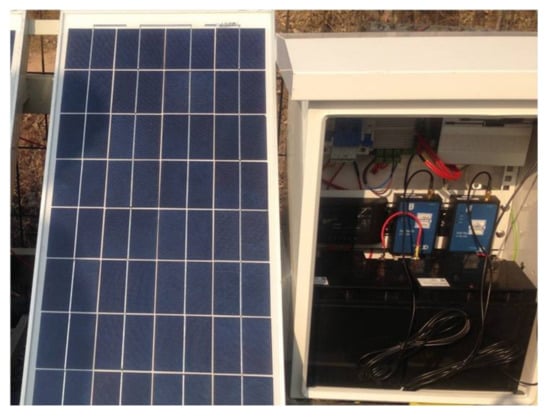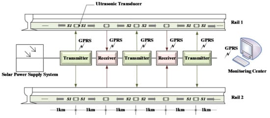 An already available UGW-based track monitoring system has been used here to estimate the track status, and, especially to detect possible breakages [29,30]. The general overview of the system is depicted in Figure 1; it includes a monitoring center and a set of nodes distributed along the railway. Every node mainly involves a solar power supply system, a transmitter or a receiver (depending on the type of node), as well as a wireless communication module. The solar power supply system provides the power required by each node, and transmitters and receivers are placed alternately every 1 km. Each transmitter or receiver is connected to the rail waist through two UGW transducers (one per rail), again with a distance of 1 km from each other. The rail segment between a transmitter and the following receiver is known as a track section. Through a wireless communication module, based on General Packet Radio Service (GPRS), information gathered for every track section can be sent to a remote monitoring center.
