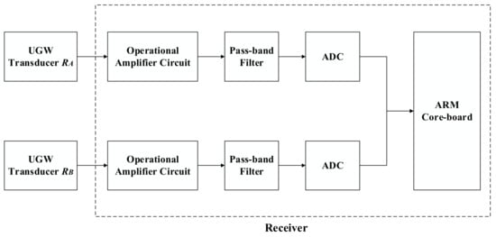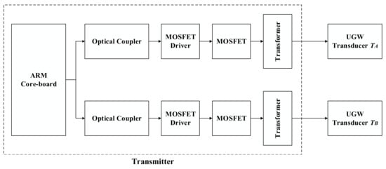 The block diagrams for both the transmitter and the receiver can be observed in Figure 2 and Figure 3, respectively. The transmitter structures are denoted within the dotted box, where the available ARM core is in charge of generating the driving square signals. Then, these signals are sent to two identical processing lines. By means of an optical coupler, the aforementioned square signals are connected to a MOSFET driver and a transformer. The final output signals are used to energize the UGW transducers and generate the corresponding UGW signals. The transducer TA is connected to rail no. 1, whereas the TB transducer is connected to rail no. 2. At a distance of 1 km from there, the receiver is placed, according to the scheme shown in Figure 3. The corresponding UGW signals are captured by transducers RA and RB, which are connected to rail no. 1 and rail no. 2, respectively. Both received signals are processed and acquired in two different processing lines. These lines consist of an amplification stage (based on an operational amplifier) and a band-pass filter to discard undesired noise. Through the Analog-Digital Converter (ADC), the digital signals are sent to the ARM core for further processing. By checking the time and frequency characteristics of the received signals over a certain interval containing the UGW signals transmitted by TA and TB, the status of the corresponding track section under analysis can be determined.