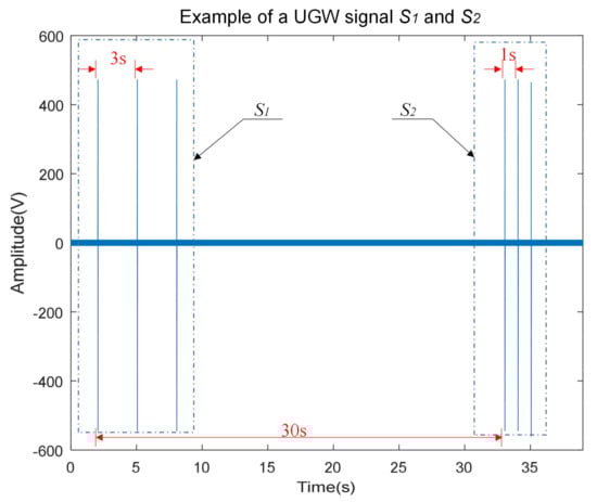 Under the ordinary working conditions of the system, all the odd-numbered transmitters simultaneously drive their ultrasonic transducers TA and TB to transmit their own characteristic signal S1 to both sides, left and right, along the rails. After thirty seconds, all the even-numbered transmitters proceed in the same way to generate their own signal S2 to both sides. Therefore, transmitters TA and TB can alternately emit the corresponding signals S1 and S2 every 30 s. Examples of signals S1 and S2 captured in the transmitter, after the transducers are plotted in Figure 4, where common amplitudes are around 500 V. Both signals S1 and S2 consist of three typical trains of UGW pulses (every train formed by 30 square pulses with a length of 33.33 μs). Though the waveform of both signals is similar, the interval among these three trains of UGW pulses is 3 s for the signal S1, whereas it is only 1 s in the case of S2. Since the receivers and transmitters are fully synchronized, receivers can detect which signal, S1 or S2, is received at any moment and then manage the ADC to acquire the corresponding signals every 3 s or 1 s, respectively, all of them inside a time window of 20 ms to include a train of UGW pulses. Note that the sampling frequency in the ADC is fs = 250 kHz.