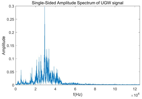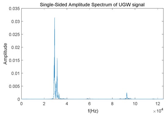 Finally, the frequency analysis is carried out by computing an FFT (Fast Fourier Transform) algorithm. As an example, the FFT outcome for the UGW signal with a length of 20 ms shown in Figure 6 is represented in Figure 7. As expected, the dominant frequencies are mainly focused around 30 kHz; furthermore, though there is a peak at 92 kHz, its amplitude is low, and this is caused by the mix of traction currents and environmental noise In this work the focus was on the highest frequency component fP and its amplitude P in the received signal, about 30 kHz for the example shown in Figure 7.