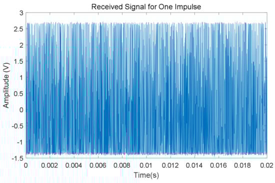 In the case of an occupied track section, though all the UGW signals are masked by noise, the receiver can still obtain the 20 ms long signals, including the transmitted train of pulses, thanks to the existing synchronization between transmitters and receivers. For example, Figure 9 shows an interval of 20 ms, which contains the masked UGW signals for an occupied track section, whereas the same signals in the frequency domain have been plotted in Figure 10. Due to the 30 kHz band-pass filter, the frequency spectrum is still focused around that value; nevertheless, when compared to the frequency spectrum in Figure 7, the energy is more spread in the frequency domain under the occupied situation.