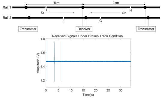Diagram and example of UGW signals received in rail no. 2 for a broken track section.