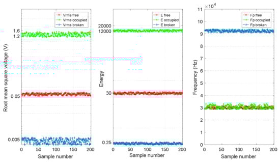For each section Si, the three features [VRMSi Ei fPi] were determined. Therefore, it was possible to analyse the representative collected data for the three track statuses considered and to verify the correctness of the feature extraction proposed in this work. In Figure 16, three different plots allowed us to observe how the three estimated features [VRMSi Ei fPi] behave for each of the different track statuses considered in rail no. 2. For every feature, 200 representative sample values were available. As can be observed in Figure 16, if the track section is free, all three features [VRMSi Ei fPi] achieve their ordinary values; for the occupied track status, the features VRMSi and Ei are much higher than those of the free status, although the frequencies fPi are similar to those in the free track section. Finally, if a breakage occurs, the received UGW signals are lost, and VRMSi and Ei are closed to zero, although the frequency component fPi with the largest amplitude P under this track status, are higher than those for a free track section. Also, Figure 17 shows that the three features for rail no. 1 behave in a similar way. Thus, by combining the three features together, the three different track statuses can be clearly classified for both rail no. 1 and rail no. 2.