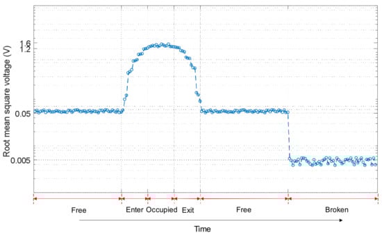 As has already been mentioned, in the proposed UGW-based track monitoring system, a receiver acquires the transmitted signals S1 and S2 coming from the next emitters in both directions. The corresponding track status can be estimated by analyzing those signals. For every section under analysis, the track status can be mainly classified into three types: free, occupied and broken. For that purpose, the received UGW signals are processed over a time window of 20 ms. The status of the corresponding track section is proposed to be determined by extracting the following three identifying features: the root-mean-square (RMS) value VRMS and the energy E from the received signals, and their more relevant frequency component fP (corresponding to the amplitude peak). For clarity’s sake, it is worth noting that both rails, no. 1 and no. 2 have the same setup, so only those signals coming from rail no. 2 will be described in detail here for the three considered cases (free, occupied and broken), thus assuming that similar conclusions can be extended to the other rail.