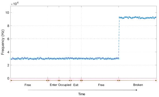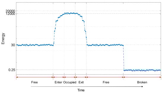 In Figure 16 and Figure 17, it is possible to see that the track status can be easily distinguished in a permanent situation. Nevertheless, in some cases, it is also important to determine the status trend: that is, the temporal behaviour for every track section Si under analysis. Information about the evolution over time of a track section status can be used to distinguish more complex conditions or effects, such as the influence of weather or rail degradation. For that purpose, the temporal trend of the three features [VRMSi Ei fPi] for the collected experimental samples for a certain track section Si was analysed and this is shown in Figure 18, Figure 19 and Figure 20. Each figure includes six different statuses over time. As can be observed in Figure 18, if the track section Si is free, the feature VRMSi stays at a lower constant value. When there is a train passing along the track section Si, the values for VRMSi start to increase as the train approaches, reaching a maximum when the track section is completely occupied by the train. In the same way, VRMSi decreases gradually as the train exits from the track section Si, and then it recovers the previous low value for a free status. Finally, when a breakage occurs in section Si, the feature VRMSi drops abruptly to almost zero. With regard to the temporal trend of the energy Ei shown in Figure 19, it has a similar evolution as VRMSi. As far as the frequency component fPi is concerned, no matter whether the track section Si is free, the train is approaching or exiting, or the section Si is occupied by the train, the maximum frequency component fPi maintains an almost constant value around 30 kHz. Nevertheless, this value sharply increases up to fPi = 92 kHz when the track status is broken, as can be observed in Figure 20.