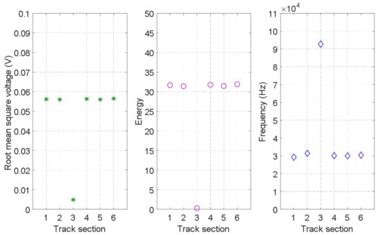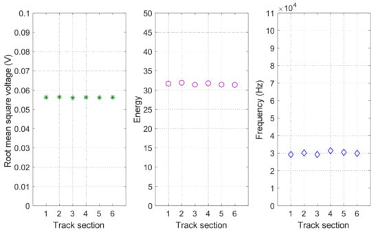 Taking into account the comments above, it is possible to observe that the RMS value VRMS, as well as the energy feature E, have the same variation trend for the three considered track statuses, where the broken track section has the minimum energy value and the occupied track section provides the maximum value, mainly due to existing noise. With regard to the frequency feature fp, which represents the largest amplitude P in the signal spectrum, it is similar for the free and occupied sections, but it can be clearly distinguished in a broken track section. All three features combined together make it possible to classify the three considered track statuses.
