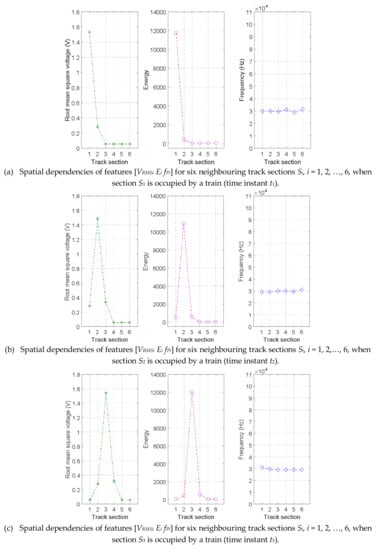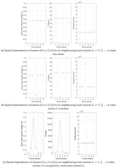 The same analysis for the spatial dependencies of features [VRMSi Ei fPi] for six neighbouring track sections in rail no. 1, can also be seen in Figure 24, where similar behaviours as those previously presented for rail no. 2 in Figure 23 were observed. Figure 24. (a) shows the case when all the six track sections Si are free, whereas in Figure 24. (b) track section S3 is broken and in Figure 24. (c) track section S3 is occupied by a train.