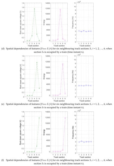 Finally, an illustrative situation, at which a train is passing from track section S1 to track section S6 in rail 2, is described. The spatial and temporal dependencies of three features [VRMSi Ei fPi] for this situation can be observed in Figure 23, from (a) to (f), at different times. Firstly, at t1, the track section S1 is occupied by a train, so the features VRMS1 and E1 are the highest. Even though the other five sections are free, due to the influence of the mechanical noise caused by the train, the neighbouring section S2 has relatively higher values than the others. When the train is moving from track section S2 to track section S5 (from t2 to t5), no matter which section is occupied, the features VRMSi and Ei in the corresponding section Si are the highest, although their immediate neighbours still present relatively higher values than the other three free sections. Finally, when the train arrives in the track section S6, the feature VRMSi and Ei for track sections S1 to S4 are similar, the values for track section S5 are slightly higher, and the highest values are obtained for track section S6 (time instant t6). It is worth noting that no matter where the train is, the frequency components fPi for the six track sections Si always show quite stable behaviour. Figure 23 allows us to conclude that a train occupying a certain track section affects, not only that particular track section, but also the immediate neighbouring sections. This spatial dependency can be used to improve the final track section status classification.