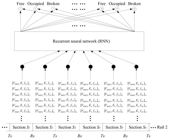 Since both rails, no. 1 and no. 2, present the same setup, similar networks can be applied in both cases. This is why the status classification is only detailed for rail no. 2, assuming that it can be extended to rail no. 1. A preliminary approach for the status classification process is depicted in Figure 25, where, six track sections Si, i = {1, 2, …, 6} are involved in the lower part. As was described earlier, the three features [VRMSi Ei fPi] are calculated for every 20 ms long UGW signal window and for each section Si, thus becoming the inputs for the RNN. Through the RNN processing, the output layer of the network consists of 18 track status classification units, each three belonging to a section Si and denoting the three statuses mentioned before: free, occupied and broken.