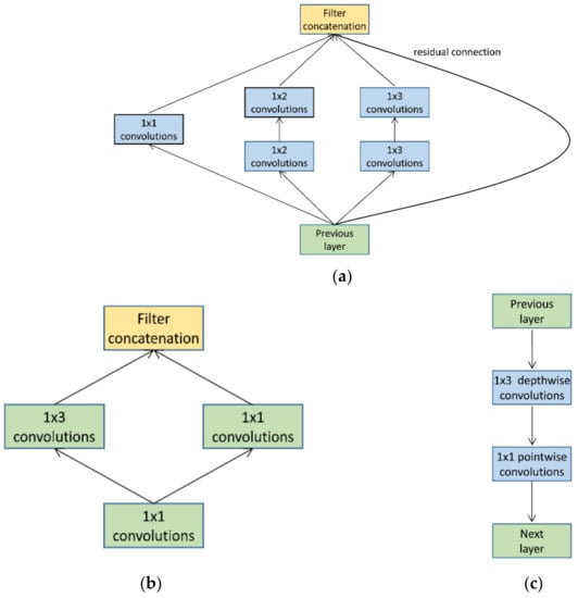 - Lite module layer: The use of a small filter size can reduce the computational cost and enhance the abstract representations of local features in a heterogeneous convolutional layer. The Lite module has filter sizes of 1 × 1, 1 × 2 and 1 × 3 for this purpose, as shown in Figure 4, and the feature map settings of the Lite module layer are listed in Table 1.