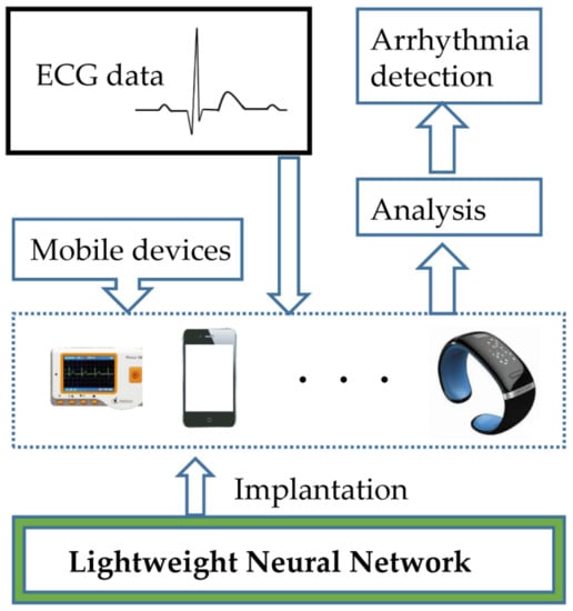 With conventional machine learning, the diagnosis of arrhythmias using ECG requires several processes: data preprocessing, feature extraction, normalization and classification. Due to the existence of baseline drift and ECG noise (e.g., muscle motion), it is vital for traditional machine learning methods to perform efficient and accurate de-noising operations before feature extraction can be employed. Common solutions, such as the low-pass linear-phase filter, high-pass linear-phase filter, median filter, and mean median filter, are usually used for such de-noising task. Classical feature extraction approaches, such as continuous wavelet transform (CWT) [25], S-Transform (ST), discrete Fourier transform (DFT), principal component analysis (PCA), Daubechies wavelet (Db4) [26], and independent component analysis (ICA) [27] can then be applied. Researchers in [28] used three machine-learning based algorithms, namely, Discrete Wavelet Transform (DWT) [29], Empirical Mode Decomposition (EMD) [29] and Discrete Cosine Transform (DCT) to obtain coefficients from ECG signals. Then, the researchers adopted the Locality Preserving Projection (LPP) method to reduce the number of these coefficients and used the F-value measure to rate the LPP features. Finally, the best coefficients were fed into the K-Nearest Neighbor (KNN) model for arrhythmias diagnosis. The results from the experiments proved that the machine-learning-related algorithms that they devised achieved excellent performance. Similarly, Personalized Features Selection and Support Vector Machines were used to identify arrhythmias in [30,31], respectively. They are able to extract features accurately and achieve good results. However, traditional machine learning approaches to classify ECG data usually requires complex data preprocessing, thus embedding them into mobile devices increase heavy workload on the device.