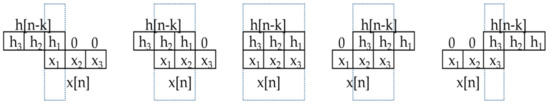 where x[n] is the input sequence of length m, h[n] is the kernel sequence and y[n] is the output sequence. Our proposed LiteNet adopts Equation (1) as the kernel function. For example, the length of x[n] is 3, the length of h[n] is 3, so the length of output is 5. The input sequence is x[n] = [x1, x2, x3], the kernel sequence is h[n] = [h1, h2, h3]. h (−k) is to reverse the sequence of h(k), while h(n–k) is to translate the h(−k) to n points. The output sequence therefore is,