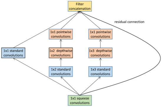 - Iandola, F.N.; Moskewicz, M.W.; Ashraf, K.; Han, S.; Dally, W.J.; Keutzer, K. SqueezeNet: AlexNet-level accuracy with 50× fewer parameters and <0.5 MB model size. arXiv, 2016; arXiv:1602.07360. [Google Scholar]
