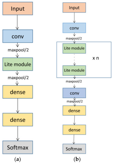 Now that the Lite module has been introduced, we describe the LiteNet architecture in detail. LiteNet is built from Lite module layers, which represent an efficient convolution module design approach, as described above. They can reduce sharply both the parameter volume and the computational cost. As illustrated in Figure 5, a basic LiteNet model consists of a single Lite module, which we use in this study, as shown in Figure 5a. An extended LiteNet model contains a stack of Lite modules, as shown in Figure 5b.