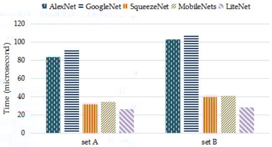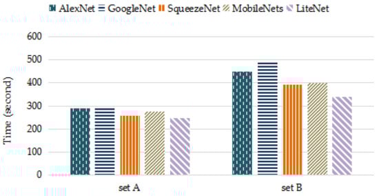Table 6 and Table 7 present the performances of the LiteNet model and the four comparison models on set A and set B, respectively. For PC, LiteNet decreased about 10% PC than MobileNets and SqueezeNet, while AlexNet and GoogleNet use twice as many PC than LiteNet. The computational complexity of deep-learning based methods in both training and working phases is closely related to PC. Smaller PC can make the algorithms deployed on resource-constrained mobile devices to carry out timely task easily. Furthermore, SqueezeNet and MobileNet have been successfully deployed on resource-constrained mobile devices, such as mobile phones, robotics and self-driving car. LiteNet has smaller parameter volume compared to MobileNet and SqueezeNet, which ensures a lower computational cost and also can be deployed on resource-constrained mobile devices. For accuracy, the basic LiteNet model achieved the expected accuracies of 97.87% and 98.80% on sets A and B, respectively. From the result we conclude that longer data period produces higher accuracy, since the data within each period in set B contains a complete heartbeat signal, instead of partial data per heartbeat present in set A. LiteNet slightly outperforms SqueezeNet and MobileNet. The AUC measure is also used to assess the model performances. LiteNet achieved AUC values of 97.78% and 99.30%. According to Table 3, LiteNet is considered as an excellent classifier in random conditions. There are several explanations for the performance of LiteNet: the Adam optimizer is used in the training process, and the Lite module uses the postponed down-sampling strategy. Figure 7 presents the training times of the five models in the training phase. LiteNet achieved the best performance, as we expected. LiteNet required less training time than the other four models. Figure 8 presents the average testing time of the five models on all testing samples with cross-validation method and LiteNet uses less testing time than compared models. Although LiteNet, SqueezeNet and MobileNet use similar time on set A, it is obvious that LiteNet uses shorter time to produce arrhythmia detection results than SqueezeNet and MobileNet on set B. According to Figure 8, it can be inferred that the longer data is, the less time LiteNet uses to produce results than compared models more visibly. There are several reasons for testing time results. Firstly, the data is longer, more sliding convolution operations are required in a convolution layers (the longer data is, the more computing time requires). LiteNet uses 1 × 1 convolution squeeze layers and depthwise and pointwise convolution layers, which both can reduce computational complexity (testing time) sharply as introduced in Section 2.1, while SqueezeNet only uses 1 × 1 convolution squeeze layers and MobileNet just uses depthwise and pointwise convolution layers. Secondly, LiteNet uses one less pooling layers than both SqueezeNet and MobileNet, which reduce a step to process data.