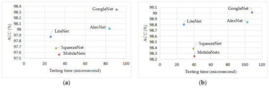 The trade-off between accuracy and testing time on five models. (a,b) represent dataset A and dataset B, respectively.
