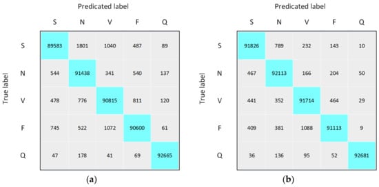 To better understand the misclassified cases and overall classification performance of LiteNet, we present confusion matrix graphs of LiteNet on set A and set B in Figure 10. The number of true labels for each class is equal after data preprocessing. This number can be more convincing to validate whether the model is good or bad. According to Figure 10a,b, normal beat corresponds to the worst precision results of 96.54% and 98.23%, respectively; supraventricular ectopic beat corresponds to the worst sensitivity (recall) result of 96.33% on set A, and fusion beat corresponds to the worst sensitivity (recall) result of 97.97% on set B. Based on the performance results, we summarize the benefits of LiteNet as follows:
