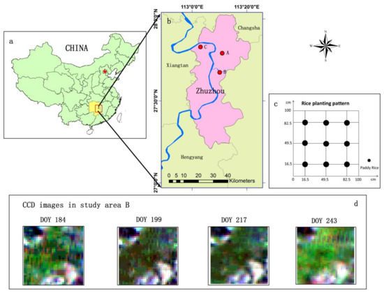 Location map for the study areas in the city of Zhuzhou, Hunan Province, China. DOY is the abbreviation for the day of year. (a) The location of Zhuzhou city in China; (b) the location of the study areas in Zhuzhou city; (c) diagram for the rice planting pattern; (d) the CCD images selected by the key periods in study area B.
