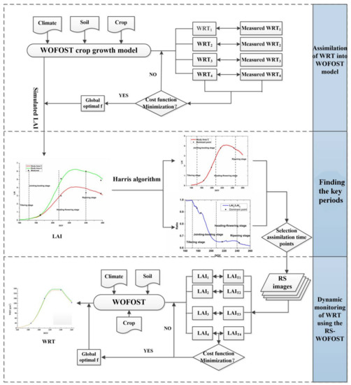 Flow chart of the WRT-WOFOST assimilation framework to find the key periods. (The WRT-WOFOST assimilation framework means assimilating the WOFOST model with WRT).