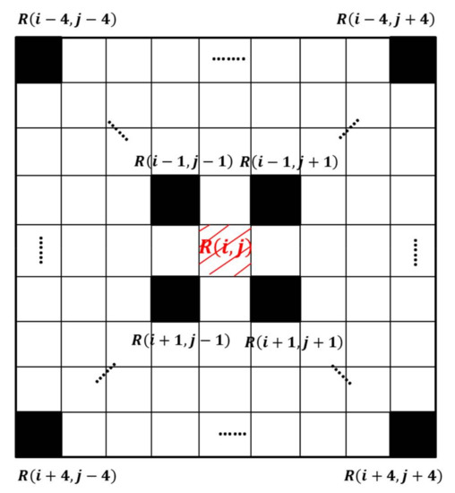 where is the derivative computed in the a direction, is the function of the Gaussian smoothing filter, and is the template size. The matrix describes the gradient distribution in the local neighborhood of a point. Gaussian kernels are used to compute the local derivatives. Then, a Gaussian window of size is used to smooth the derivatives, which are averaged in the neighborhood of the point. The Gaussian filter is programmed with template operations of various sizes (3 × 3, 5 × 5, 7 × 7, etc.); here, 3 × 3 templates will be used as an example. The average value of eight neighborhood pixels was used to replace the original value of the middle pixel to achieve the effect of smoothing. Two eigenvalues of the symmetric matrix M can be defined as and [33]. Therefore, the eigenvalues can represent two principal signal changes in the neighborhood of a point. The eigenvalues can help the extraction of points, where exist significant variation of curvatures, such as corner points and junction points. The Harris detector, which is one of the most popular interest point detectors, is also based on this principle [32,46,47]. Thus, the Harris measure combines the trace, where the determinant of the second moment matrix can be expressed as: