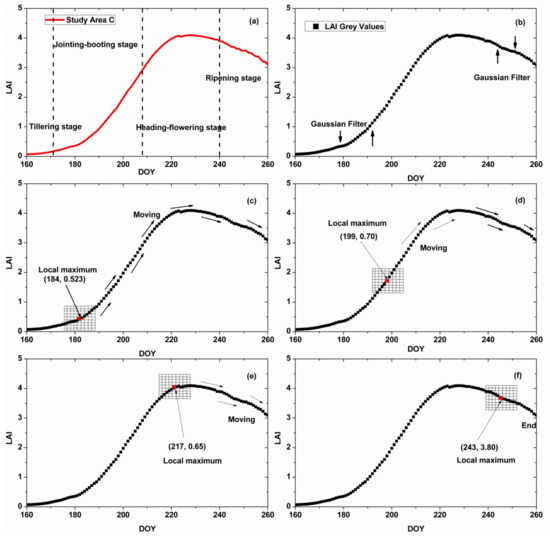 Process of the Harris algorithm of the LAI curve in study area C: (a) original LAI curve; (b) LAI curve with Gaussian filter; (c–f) process of searching for the dominant points in the LAI curve.