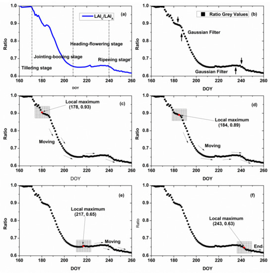 The dominant corner point is the location of local maximum, i.e., if the center of window is greater than the other pixels of the window, the center point is the dominant corner point. Figure 5 shows the Harris algorithm process for the LAI curve, which searches for the dominant corner point. When meeting local maxima, the Gaussian window stops and records the location and then moves on. During the whole process, the dominant corner points were selected.