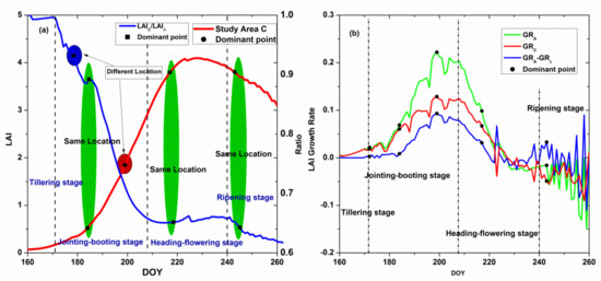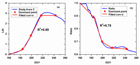 Assessment of the accuracy for the four dominant points. (a) shows the the fitted results of the LAI in study area C, (b) shows the ratio of the LAI in the two study areas.