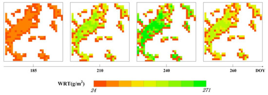The WRT, the plant organ most sensitive to heavy metal stress, is widely used in the monitoring of heavy metal contamination of rice [24,26]. To verify the appropriate monitor key period, the assimilation method was introduced to dynamically simulate the WRT. The unit of the WRT simulated by the WOFOST model is kilograms per hectare (), which is too coarse for a parcel of the rice field in the study area. Thus, in this study, the unit was converted to grams per square meter (). As illustrated in Figure 1c, it is assumed that the rice plants in the study areas are uniformly distributed, where there are nine paddy rice plants in one square meter. Then, the average WRT was multiplied by nine with the unit of grams per square meter as the measurement.