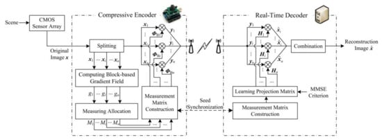 At the real-time decoder, we first reconstruct the measurement matrices of all the blocks. These matrices are required to be the same as those at the compressive encoder. According to the property of pseudorandom sequence, we only need to synchronize the seeds of pseudorandom sequences that are used both at the encoder and at decoder. Then, depending on MMSE criterion, we learn the projection matrix Hi of xi, and obtain the estimation u matrix-vector product. Finally, we combine all of the block estimations into the reconstructed image .