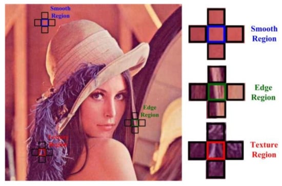 Illustration of visual contrasts among blocks on smooth, edge and texture regions of Lenna. Note that the size of block is 16 × 16.