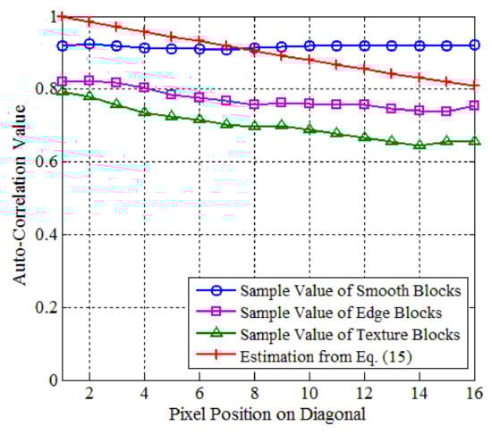 where δp,q is the chessboard distance between xi,p and xi,q, and ρ is an empirical value, which is set to be 0.95. We extract smooth, edge, and texture blocks of 16 × 16 in size from 10 test images of 512 × 512 in size, and construct the sets of smooth, edge, and texture blocks, respectively. For each set, we compute the sample values of the auto-correlation matrix, and present the sample auto-correlation values of pixels on diagonal in Figure 4. From Figure 4, it can be seen that the sample values of smooth blocks vary steadily as the distance between the pixels increases, but the sample values of edge and texture blocks drop off. The estimated values of Equation (15) constitute a good fitted curve that synthesizes three different variations of smooth, edge, and texture blocks. Therefore, the estimation from Equation (15) is a good balance among the sample values of various block classes.