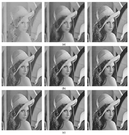 Comparison of subjective visual qualities of Lenna reconstructed by different recovery algorithms at S = 0.1, 0.3 and 0.5, respectively. From left to right: OMP, NESTA and the proposed algorithm. (a) S = 0.1, (b) S = 0.3, and (c) S = 0.5. Note that S is the measurement rate.