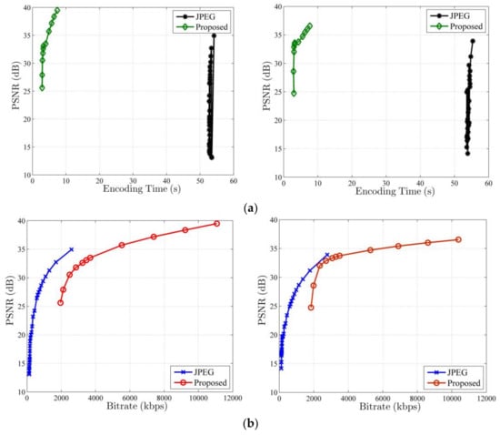 Time-distortion and rate-distortion curves of the proposed system and JEPG for Foreman and Container sequences. (a) Time-distortion curve and (b) Rate-distortion curve. Left is Foreman, and Right is Container.