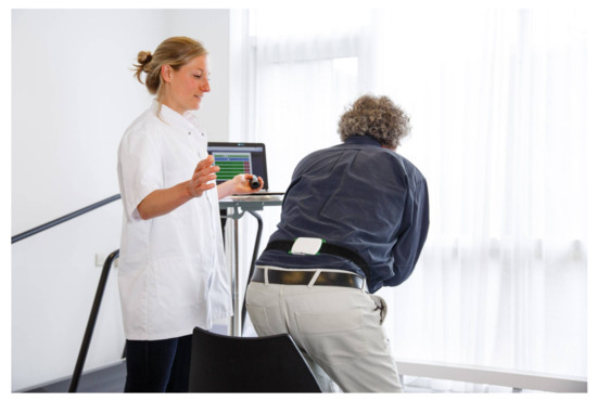 The experimenter stayed in close proximity to the patient. The protocol was implemented on a computer. With a remote control, the start and end of every STS was marked and stored with the raw data.