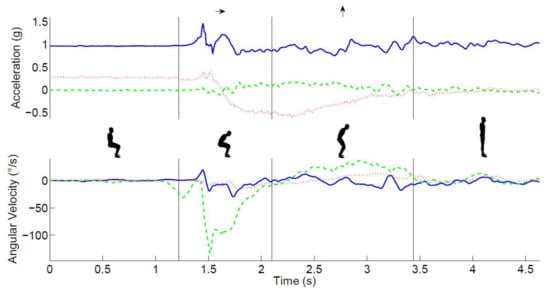 The main phases of the STS movement. The top panel shows the time series of raw acceleration (green/dashed-mediolateral, red/dotted anteroposterior, and blue/solid vertical), the lower panel shows the angular velocity (green/dashed-pitch, red/dotted-roll, and blue/solid -yaw) signals, and the insets illustrate the main phases of the STS movement, which are separated by vertical lines in both graphs.