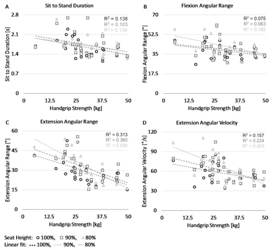 The most important outcomes are visualized in the scatterplots depicted in Figure 3. The four panels show the relation between handgrip strength (horizontal axes) and the STS duration, the flexion angular range, the extension angular range, and the extension angular velocity, respectively. As is evident from panel A, stronger subjects (i.e., with greater handgrip strength) performed the STS faster. Panel B shows that stronger subjects had a smaller flexion angular range while panel C shows that the weaker subjects had a much larger extension angular range, which increased with lower seat heights. Panel D shows a comparable effect for the maximum angular velocity during extension.