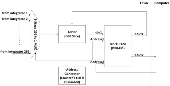 Figure 3. Out of possible configurations of internal RAM available in FPGA, 512 × 36 is found to be the most suitable for this system, although there are other configurations offering different combinations of width and depth. Reducing width cannot provide us the required integration and increasing width simply exceeds the integration requirements. Similarly increasing the length of the DPRAM can increase the number of sequentially performed integration operations, causing more cycles to finish the second integration cycle while reducing the length can results in inefficient use of RAM blocks that can cause increased power consumption.