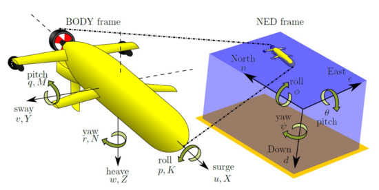 r through a rotation matrix to change from the body to the North East Down (NED) frame using the Euler angles. On the other hand, the mathematical model of the vehicle defines the relation between the angular velocity and the torque applied by the thrusters. Here, the mathematical model development is not presented, which is presented in [
