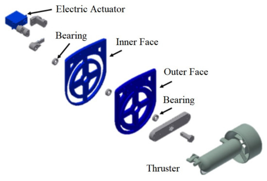 47]), each vehicle has its own design and characteristic constraints, which have to be carefully taken into consideration prior to customization planning. Therefore, low-cost, off-the-shelf components that had to be adapted to our design have been bought; i.e., to obtain a thruster vector control on the vertical plane, which allows us to adjust the angle between the lateral thrusters and the hull through actuators installed on the rear fins.