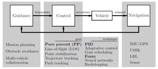 Guidance system: This is the highest control level of the vehicle during a mission. Usually, it has a waypoint generator, which establishes the points to cross to accomplish the goal of the mission. Moreover, it can incorporate several algorithms such as path planning, obstacle avoidance or multi-vehicle collaboration, to improve autonomous maneuverability.